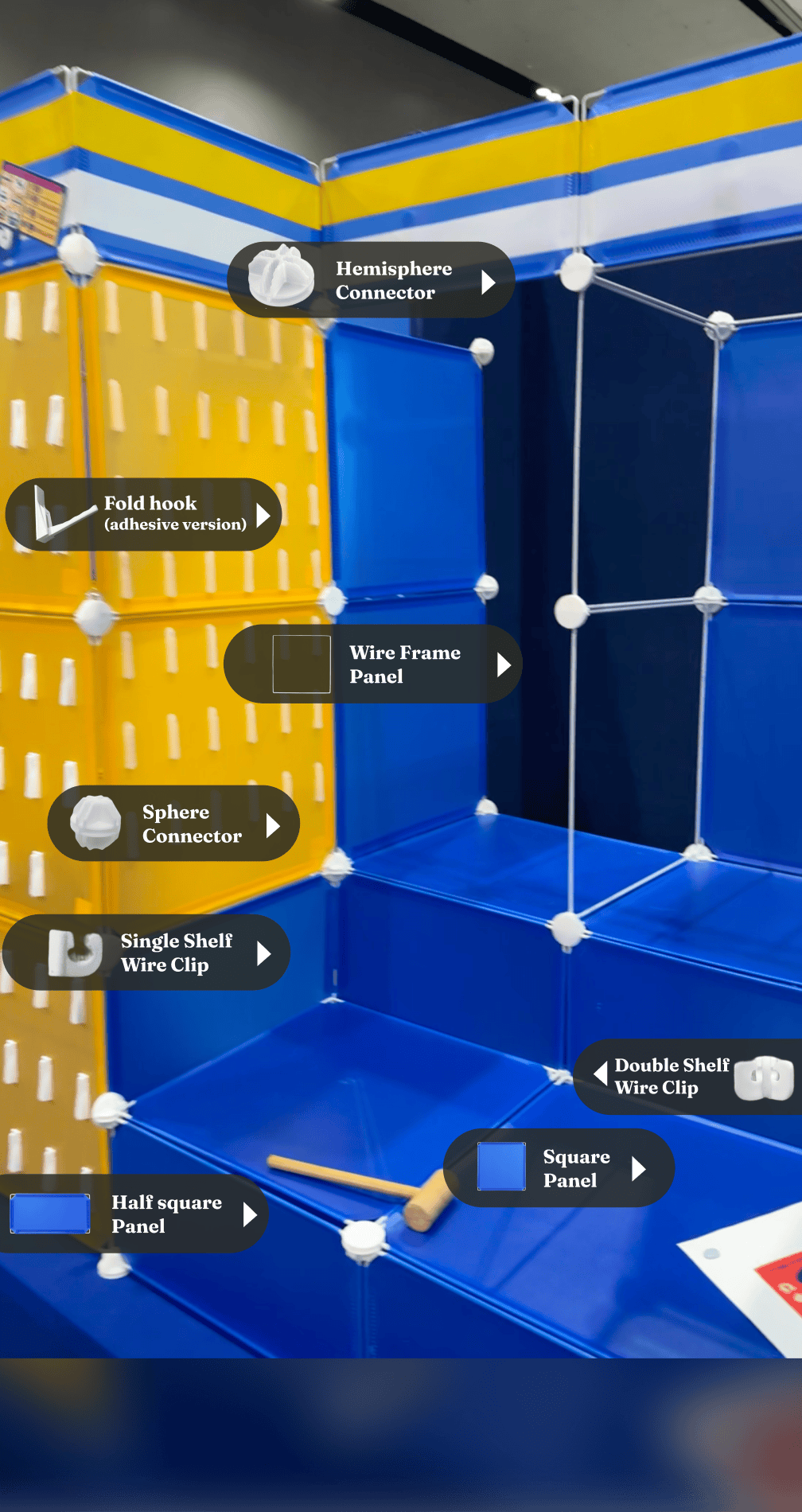 The core connector of our system. These white hemisphere connectors snap into the corner holes of any panel and hold them together firmly. They handle 90-degree and 180-degree joins between panels. Press them in by hand or tap gently with the included hammer. Weight: 7 g | 0.015 lb
