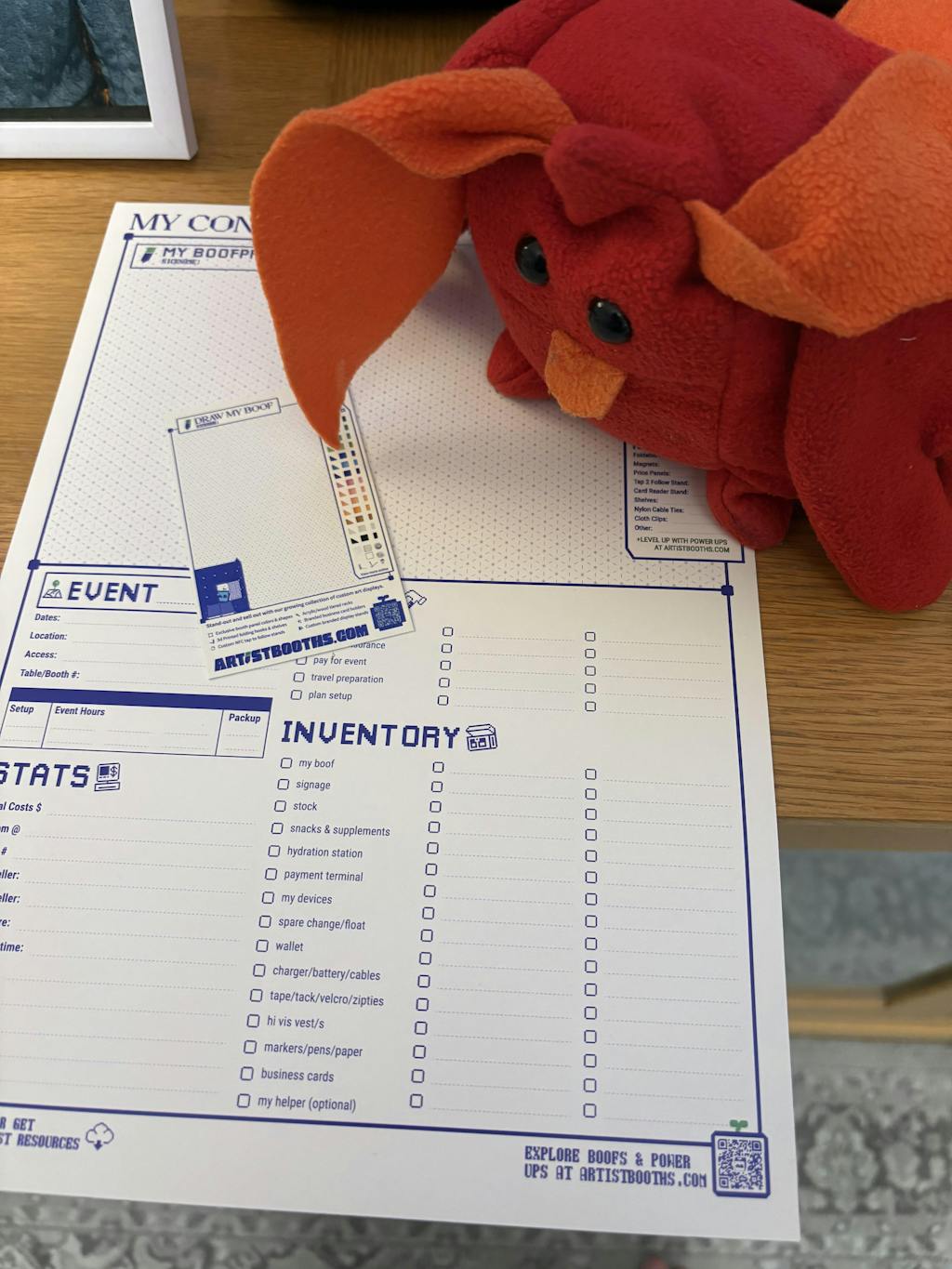 Heres the tea on safety so you & your product’s don’t bend & snap. This gear’s designed to be portable, modular, and wildly over-engineered for seller life, but here’s how to keep things snappy and pain free (literally). Also if you notice anything broken already upon shipment or missing hit up on instagram @artistbooths or hello@artistbooths.com. We try our best with attention to detail and we will always resend anything missing/broken in shipment to you for free. Now go forth. Stand out and sell out without any breakdowns (physical ones at least). 🧩 BOOF build tips Boofs are modular so what we recommend doesn’t have to be your setup. If you need a bit of ideating help you can always revisit our product thumbnails to see all our best sides and see how we stack up our example setups.⚖️ Keep It Balanced Strong booths start with solid foundations think pyramid. Heavier stuff goes low, lighter pieces on top. Use counterweights or some horizontal panels/wire frames if things feel wobbly. Even out your displays — don’t overload one side.v ⏳ Lasting longer tips Our lightweight legends are mighty but a little care keeps them strong. Treat me like your fave print & do not bend. ️ 🙏Don’t bend and snap me 💡How we want to be handled: Use both hands to push on wire edges that touch the connector your’e going into or use a mallet if not possible. ⛔ How we breakdown - Do not apply bending pressure on the wires inwards to the centre of the panels as each panel has flex limit and its soul and welded joint will snap. 🔒 Pop & lock - slide all the way in but pull out gently. Always click panels fully into the bottom of each connector to reduce gradual gaps that add up in uneven setups. When packing up only pull in the direction of the way you inserted the connectors will break if bent sideways.⚠️ Do not step all over me. They’re slippery like a Mario Kart banana and not into being walked on. Your bones (and your neighbours) will not enjoy this. ❤️🔥We like shade but not getting roasted.Rain + direct sun can wear down finishes/colours/adhesion keep them under cover at outdoor markets. 👵Natural Wear & TearTiny scuffs, especially near the corners or connector areas, are totally normal. They’re hidden once everything’s snapped together. Think of them as battle scars from artist alley glory. 🏋️ We have our limits Each four-corner-supported panel can hold up to 5 kg max. 👶 Small Parts, Big CautionSome pieces (like our connectors) are tiny. Don’t leave them lying around if little humans or curious pets are nearby. They’re not snacks. ✈️ Long distance tips Wrap the metal parts tightly with your table cover or even our packaging paper so they don’t scratch each other and don’t let anything pointy press on the plastic parts. Also slap on a fragile sticker at check-in if you’re flyings its free and reduces chances of damage. Adhesive hooks will stick with your panels — if you let them commit for 24hrs. Lay your panel flat, face up. Give it a dry wipe-down (no water, no cleaning sprays, no isopropyl). Moisture = betrayal. Take your hook + adhesive strip. Peel one side of the perforated backing off and stick it to the back of the hook. Peel the other side and press the hook down onto your panel. Apply firm downward pressure for 3–5 seconds. Repeat for each hook, then leave your panel completely alone (flat and chill) for 24 hours. No moving. No weight. Let it cook. Heads-up: Heat and humidity can mess with the bond. Think room temp, not sauna. ⚖️ Folding Hook Weight guide: No more than 100g per hook — that’s usually about approx 4x 4cm enamel pins or approx 6x 5-6cm charms. If your hooks start sagging, they’re telling you something. Remember the overall weight of panels needs to be accounted for in side panels if its getting too heavy.